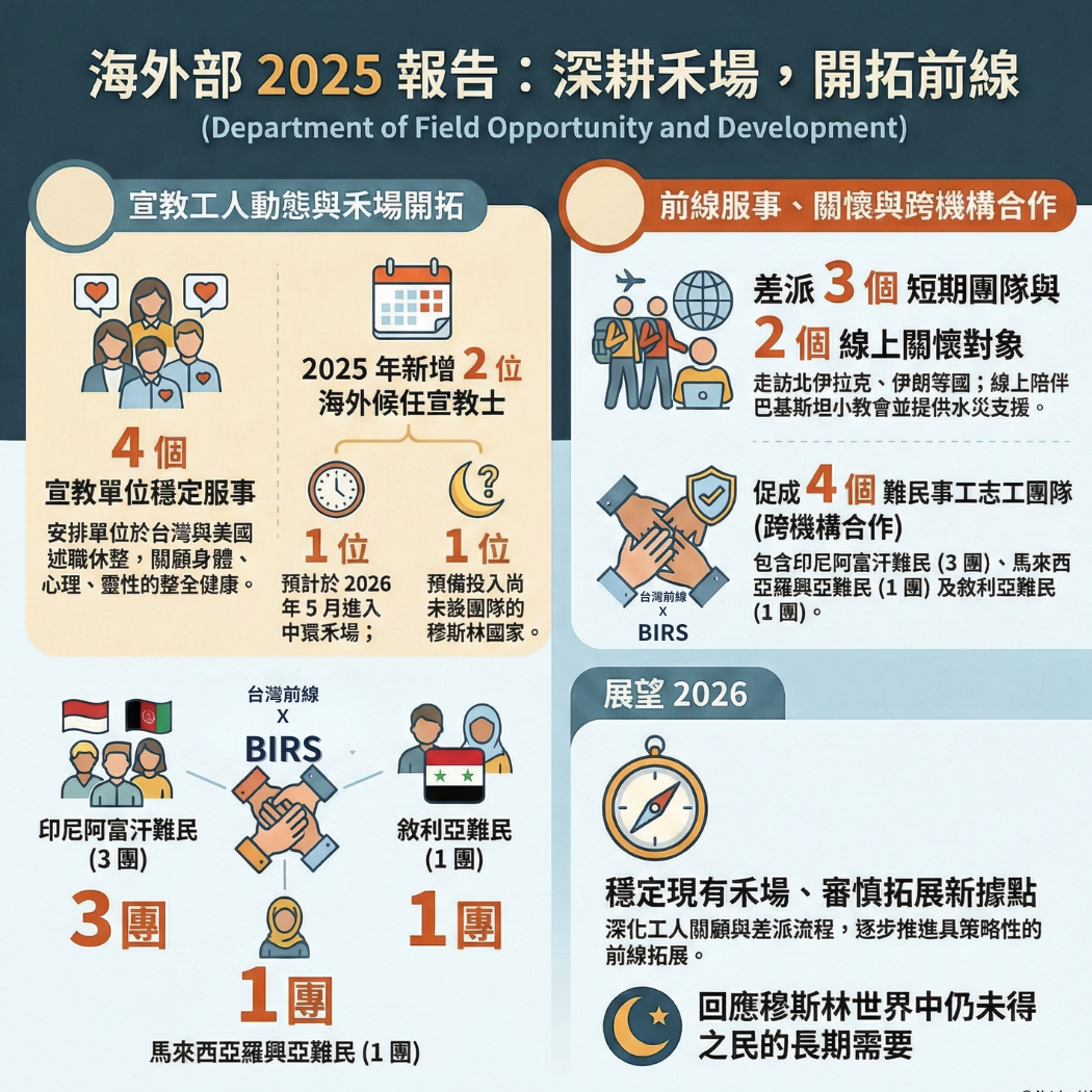 - 陪伴教會建立宣教⼠⽀持⼩組與運作 。